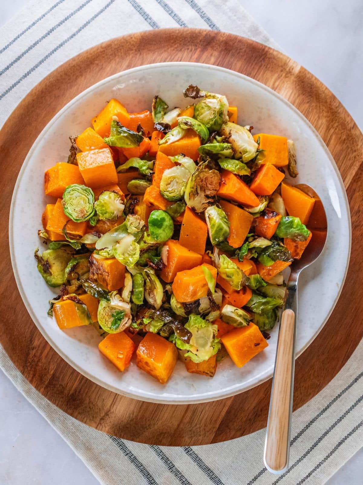 Step 1: Roast the Vegetables. Place the chopped butternut squash, sweet potato, and Brussels sprouts on the lined baking sheet and spray them with a little cooking spray. Sprinkle the crushed red pepper flakes, salt, and pepper over the veggies. Roast the vegetables for 30 minutes at 400°F. Be sure to stir them every 10 minutes.