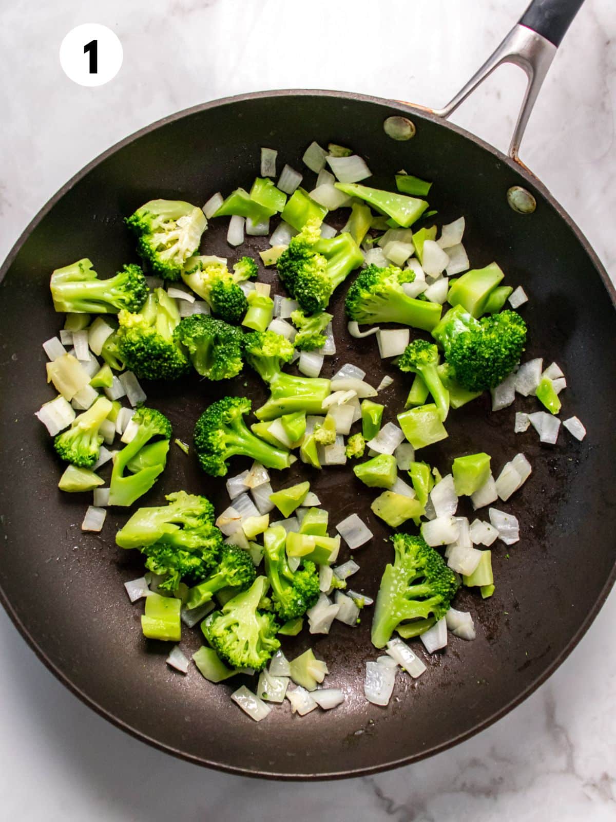 Step 1: Cook the Veggies. Sauté the onion and broccoli in a skillet with the oil over medium heat for 5 minutes, or until slightly tender.