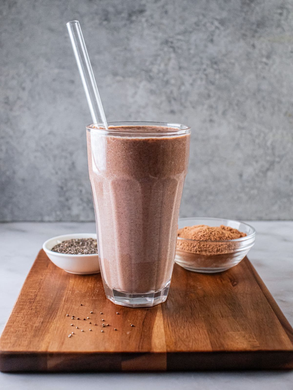 This healthy chocolate smoothie is packed with enough protein, calories, and fiber to be a healthy meal replacement. However, if you’re looking for a little something more than just a smoothie, it pairs well with a variety of bite-sized snacks and treats. Chocolate pairs well with pretty much any other flavor out there, so the options are endless!