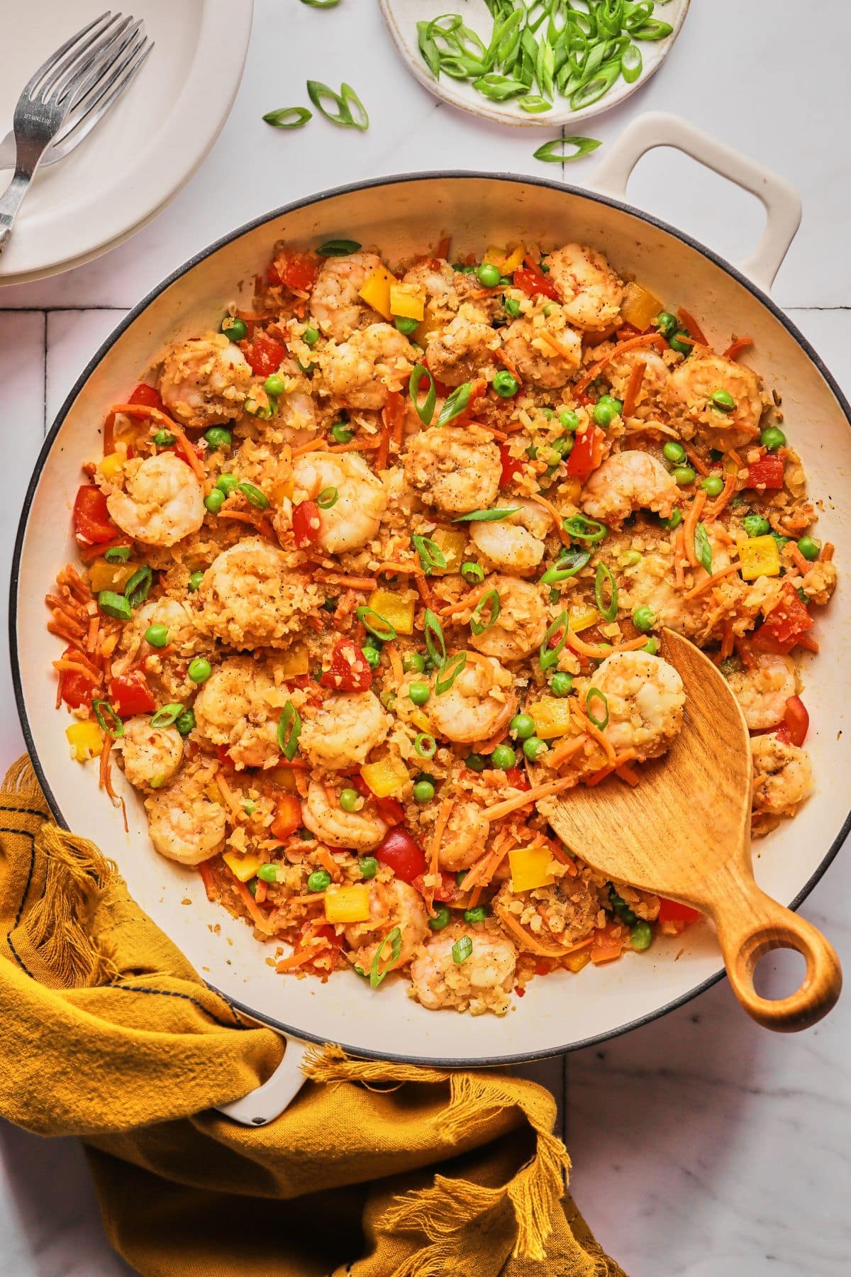 - Have Ingredients Prepped and Ready: This recipe moves fast once you start cooking, so chop your veggies and prep your ingredients before you start. This will help you avoid overcooking the shrimp or having the cauliflower rice stick to the skillet.