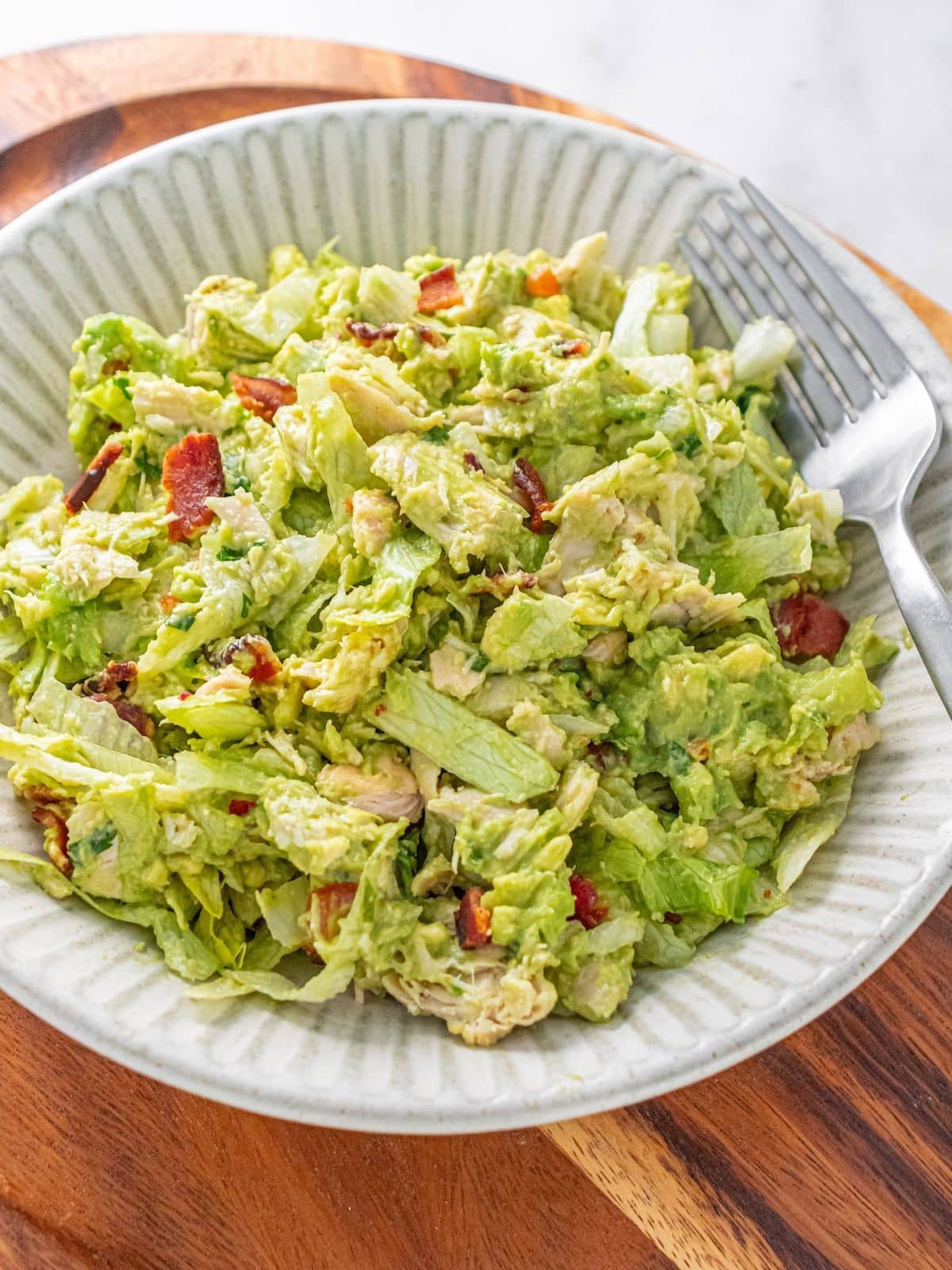 This guacamole chicken salad is already so easy, but you can make preparation go even faster by cooking your bacon a day or two in advance. Break it into bits and store it in the refrigerator until you’re ready to use it.